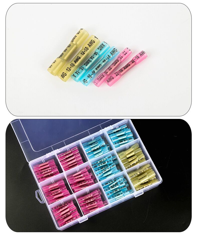 - ③【WATERPROOF】Butt Wire Splice Connector—Dual-walled Design, Polyolefin heat shrink Tubing in Outside and Hot Melt Adhesive in Inside. When heat is applied, polyolefin tubing reduces in size and adhesive flows inside the insulation. Dual walled tubing ensures waterproof seal and prevents wire corrosion