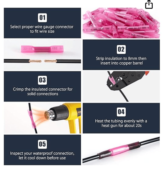 Durability & Safety – The polyolefin heat shrink tubing provides high tensile strength and resistance to stretch, minimizing mechanical damage, so there’s no worry about rat chewing or similar physical damage issues. The thick tinned copper and seamless barrel design ensure strong and secure crimping all the time with no issues of wire coming off.