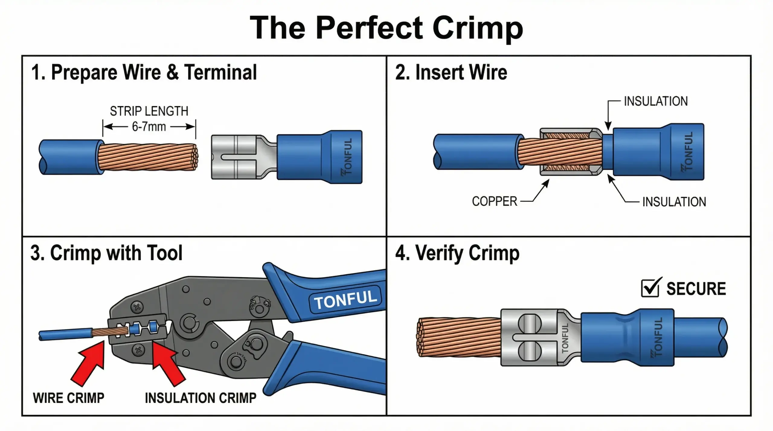 A 4-step diagram showing the correct process for crimping a TONFUL quick disconnect terminal for a secure connection.