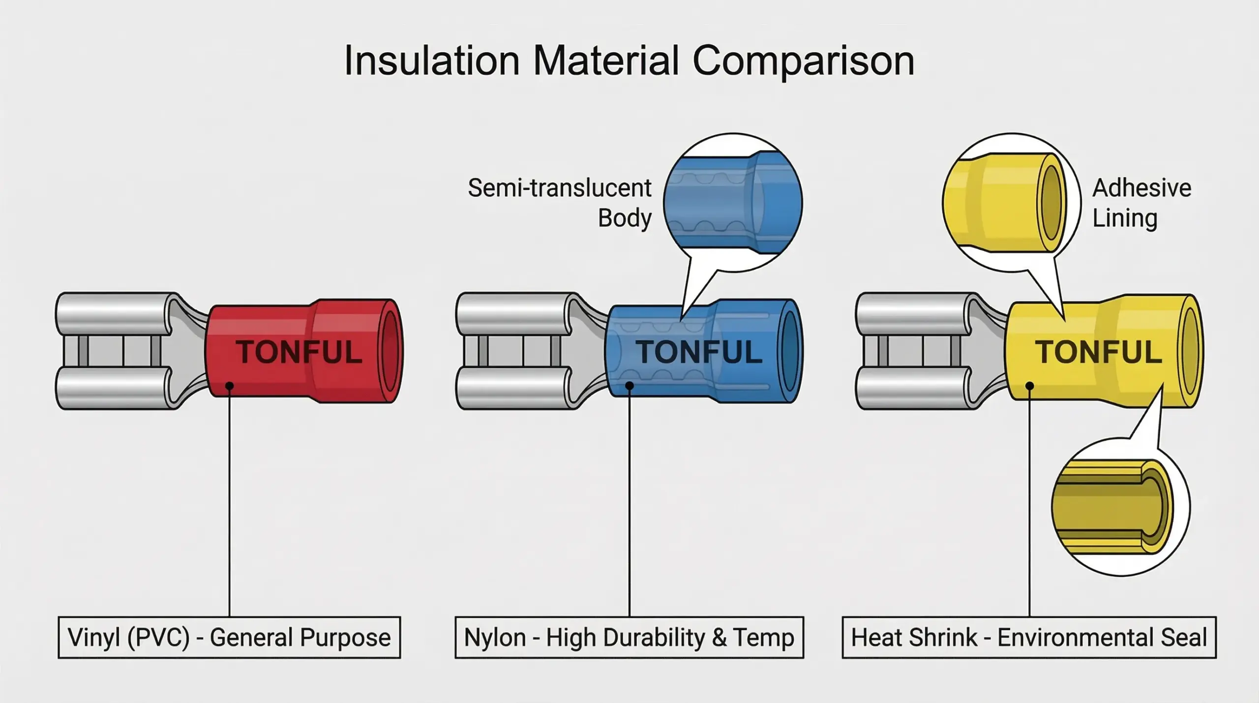 Comparison diagram of TONFUL Vinyl, Nylon, and Heat Shrink insulated quick disconnect terminals, highlighting their features.