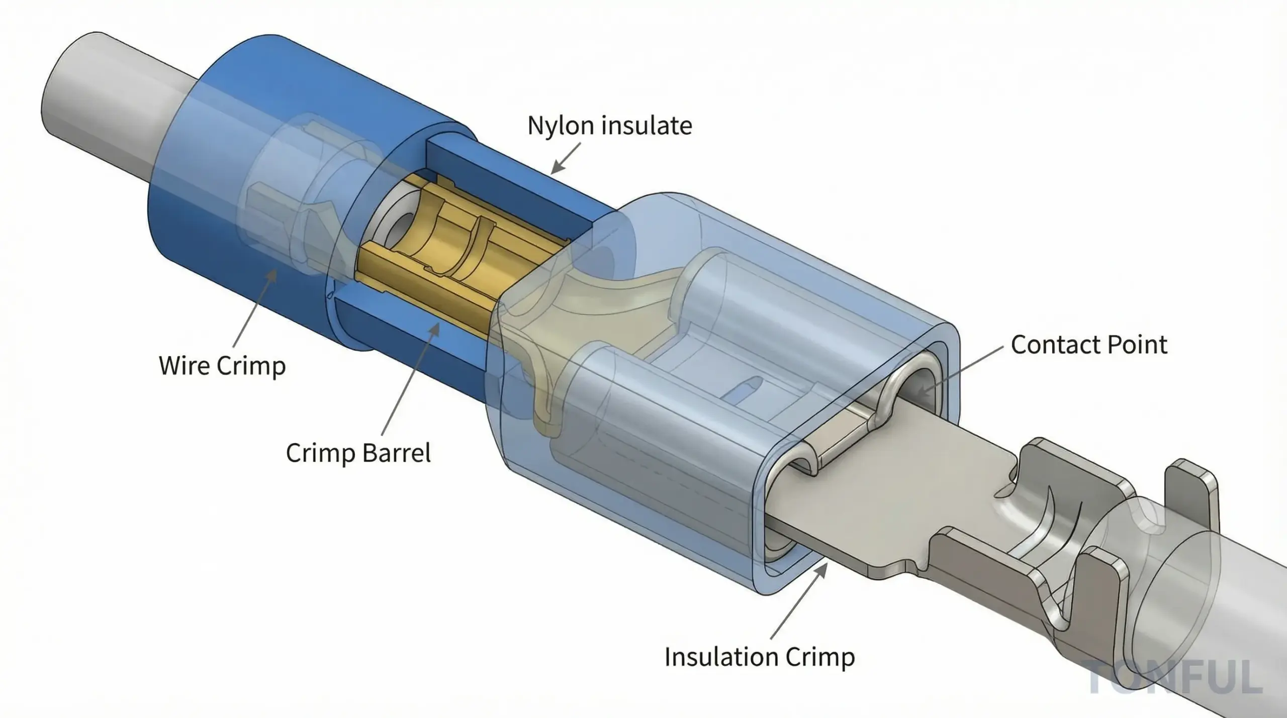 Technical diagram showing the cutaway view of a TONFUL male and female quick disconnect terminal, illustrating the secure crimp and contact points.